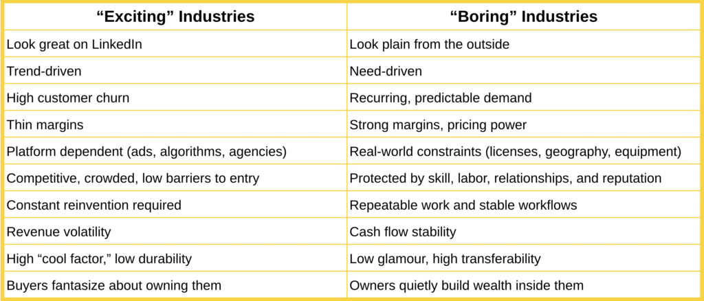 Compare that to the boring industries (specialty trades, home services, commercial maintenance, manufacturing, distribution) where demand is stable, work is repeatable, and cash flow is real.